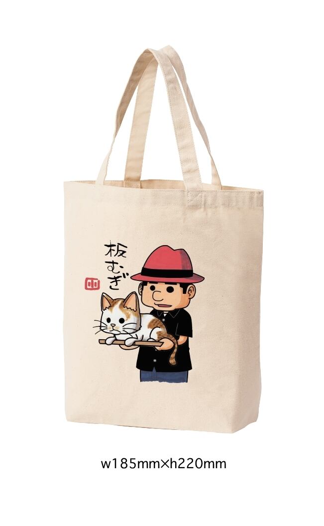 ヤポンスキー家の猫、むぎが板に乗るイラストのトートバッグです。